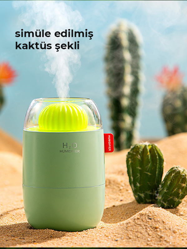 Evinizde, ofisinizde veya aracınızda doğanın enerjisini hissedin! Bu özel Kaktüs Tasarımlı nemlendirici, sadece havanızı tazelemekle kalmaz, aynı zamanda şık bir dekoratif obje ve huzur veren bir gece lambası olarak görev yapar.