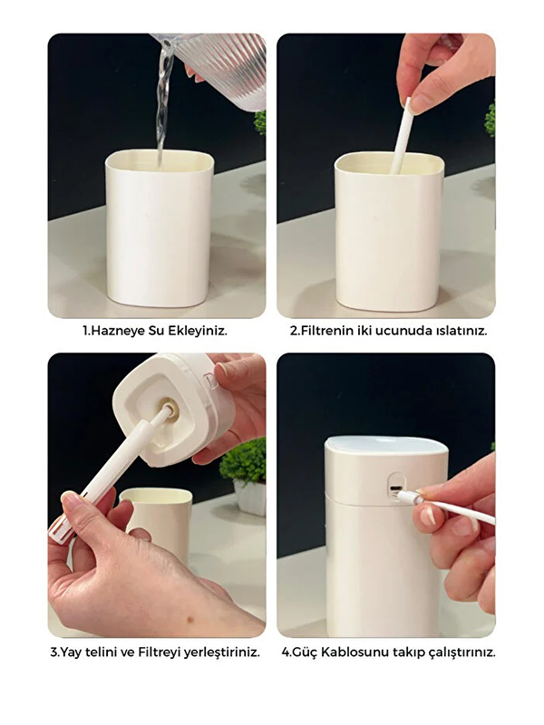 Kutu İçeriği: 1 x RGB Işıklı Hava Nemlendirici 1 x USB Güç Kablosu 1 x Yedek Pamuk Filtre 1 x Kullanım Kılavuzu